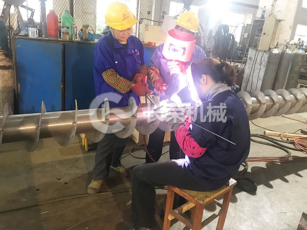 鈦材螺旋輸送機(jī)的焊接與其他黑鐵和不銹鋼螺旋輸送機(jī)的焊接工藝有所不同。鈦材的焊接需要高純度氬氣,使用直流氬弧焊并在2-3人的協(xié)助下完成焊接。圖片中的鈦材螺旋機(jī)用于輸送硫酸銨以及鎳鈷錳三元電池材料。常用于農(nóng)藥化工和電池材料行業(yè)。
